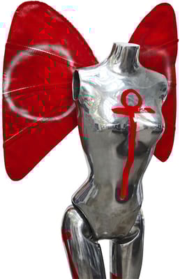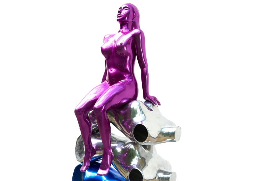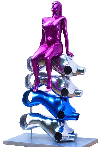 The piling of Barbie body’s without arms, legs or heads makes it very clear that Barbie is just a doll. The woman on top is proud and in no competition with the dolls…. It’s just a product.