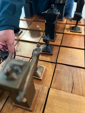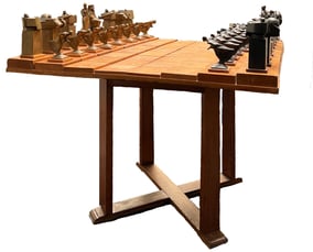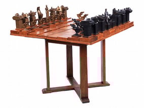 philosopher king, confront "evil", dark patina pieces led by a bemedaled general. They face one another across a stepped playing board, 43 inches by 43 inches (111 x 111