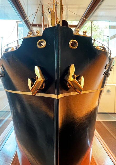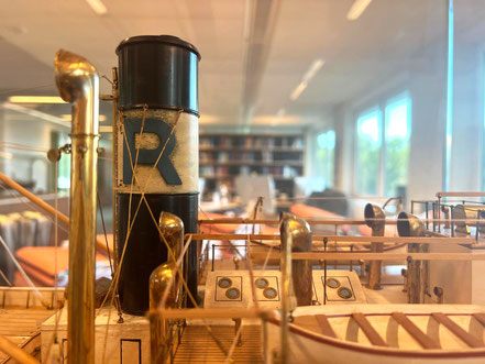 The perfectly assembled ship model – likely originating from the shipyard’s own workshop – has an impressive presence. The model-maker used quite a bit of copper in its construction. With this model, he demonstrated the full extent of his craftsmanship. The air vents, the loading gear, the rigging, and the turret-shaped hull: everything has been crafted with great precision.