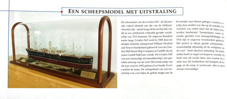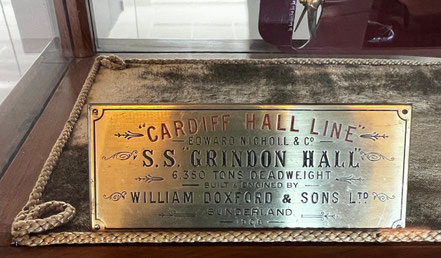 De schoorsteen van de Grindon Hall – de kleuren zijn vrijwel identiek aan die van de Holland-Amerika Lijn – steekt hoog uit boven het dek van dit in een schitterend volmodel gevatte vrachtschip van 3712 brutoton. De ongeveer honderd meter lange Grindon Hall werd in 1908 door de destijds bekende scheepswerf William Doxford and Sons in Sunderland gebouwd voor de Grindon Hall Steam Ship Company in Cardiff, die de naam Cardiff Hall Line voerde. De Grindon Hall was een turretschip (of torenscheepschip): een specifiek ontwerp van de werf. Het eerste schip van dit type werd in 1892 gebouwd en heette Turret, vandaar de naam. De scheepshuid van een turretschip was over bijna de gehele lengte aan de bovenzijde naar binnen gebogen, waardoor het schip daar smaller was dan op de waterlijn. Het voordeel was onder meer dat de luiken beter werden beschermd. Turretschepen waren bijzonder geschikt voor massagoedladingen. Tot 1914 zijn er ongeveer tweehonderd gebouwd.
