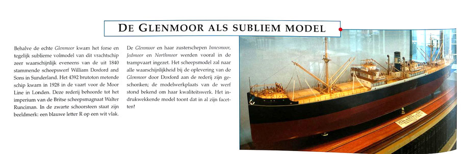 De Glenmoor en haar zusterschepen Inusmoor, Jelmoor en Norlmoor werden vooral in de trampvaart ingezet. Het scheepsmodel zal naar alle waarschijnlijkheid bij de oplevering van de Glenmoor door Doxford aan de rederij zijn geschonken; de modelwerkplaats van de werf stond bekend om haar kwaliteitswerk. Het indrukwekkende model toont dat in al zijn facetten!